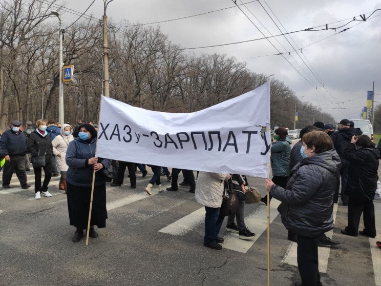 Собравшись у заводской проходной, десятки людей с плакатами отправились затем на ул. Деревянко, Сумскую и Белгородское шоссе. Здесь они каждые 15 минут перекрывали проезжую часть, двигаясь непрерывным потоком по пешеходным переходам. Протестующие в это время пропускали только специальный транспорт и автомобили, в которых находились дети. Авиастроители требовали погашения долгов по заработной плате, отпускным, больничным и другим социальным выплатам. По словам участников акции, задолженность на предприятии начала формироваться с апреля 2020-го года. В целом, «ХАЗ» должен 4 млрд гривен. Помимо заработной платы, в сумму входят налоговые платежи, кредиты и т. д. Ранее авиационному предприятию обещали госзаказ на строительство самолетов Ан-74 и Ан-140. Однако, они так и не поступили.