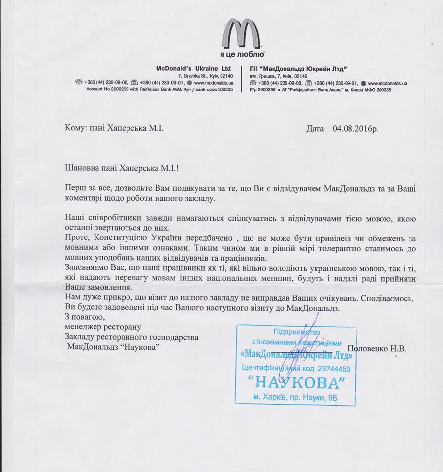 Одна из харьковских волонтеров, Марина Хаперская, обвинила на своей странице в Facebook, одно из городских заведений сети быстрого питания McDonald's в том, что работники данного учреждения, отказывают в обслуживании гражданам, которые обращаются к персоналу на украинском языке.
