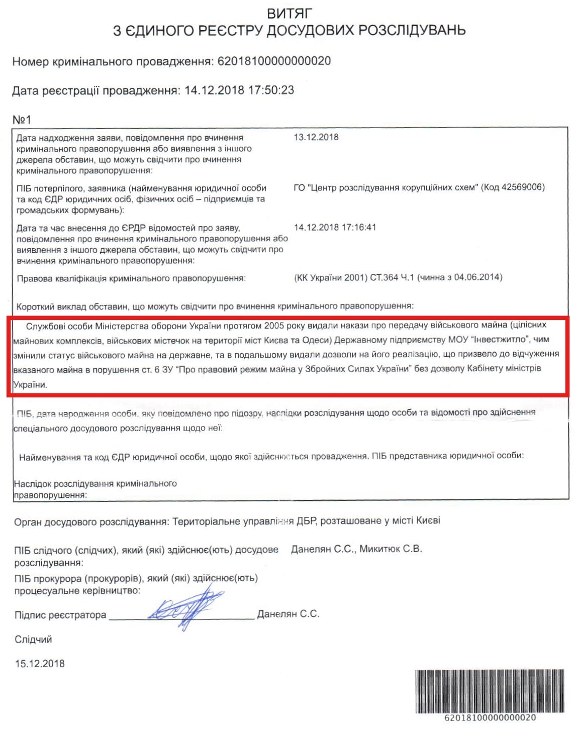 Из выписки единого реестра досудебных расследований стало известно, что по скандальным обвинениям против Гриценко о передаче военного имущества и земли в Конча-Заспе ГБР возбудило уголовное № 6201800000000020 дело по ст. 364 ч.1. «Злоупотребление властью или служебным положением».