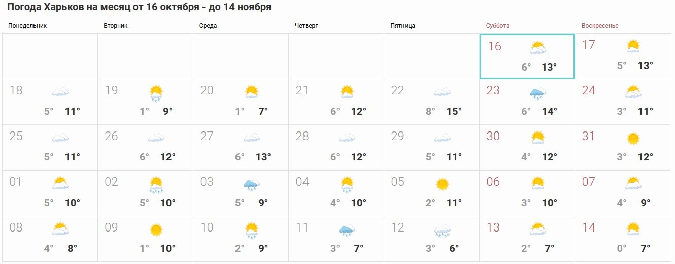 Октябрь 2021 в Харькове ничем особенным не выделяется от прошлых лет: не будет ни высоких, ни низких пиков. Ближайшая неделя после туманных выходных с небольшими дождями принесет теплые сухие и солнечные дни, за исключением дождливых вторника и воскресенья. Легкая облачность и утренний туман станут спутниками харьковчан на всю неделю. По ссылке больше информации по погоде на неделю в Харькове.